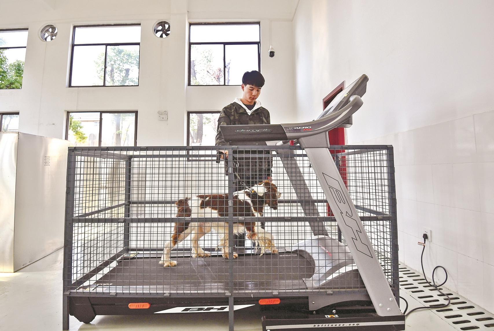 为了完成高强度工作,体能训练是每只警犬的必修课。除了越野、越障等室外训练项目,警犬们还会在跑步机上训练。记者看到,一字排开的特制跑步机上,几只警犬吐着长长的舌头,卖力地奔跑着。“警犬们跑起来,至少10公里起步。”杨文峰说。