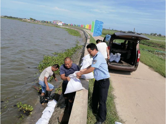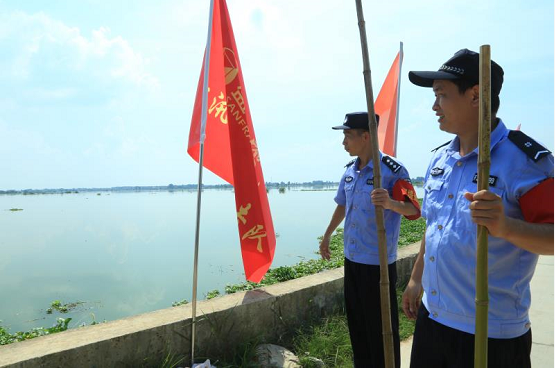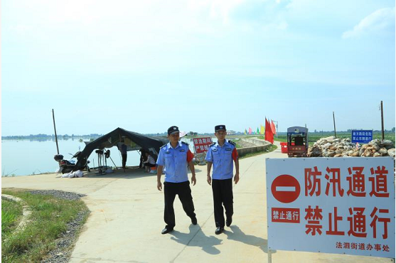 5日中午12点,民警龚俊和辅警周强炬根据工作安排到达永丰村南斧头湖大堤值守,在这段3公里的责任区内,他们负责湖堤内外的交通管制和不间断开展巡防,“平常我们和巡堤员一起,拿着探水杆查看是否有脱坡、渗水、管涌等险情;发现险情,我们开展抢险救灾,对相关路段进行管制,确保抢险车辆和物资能迅速到达。”龚俊介绍道。