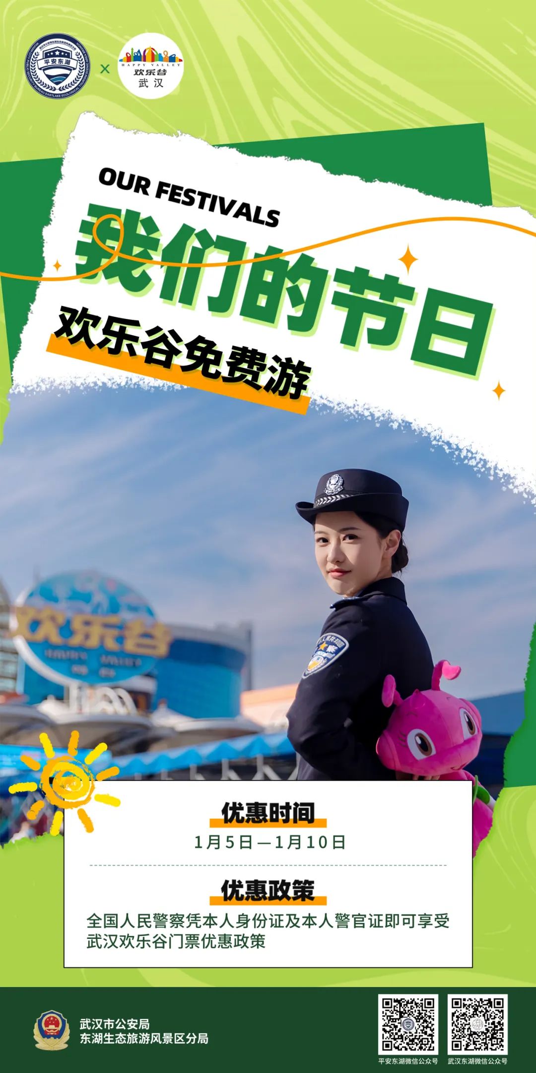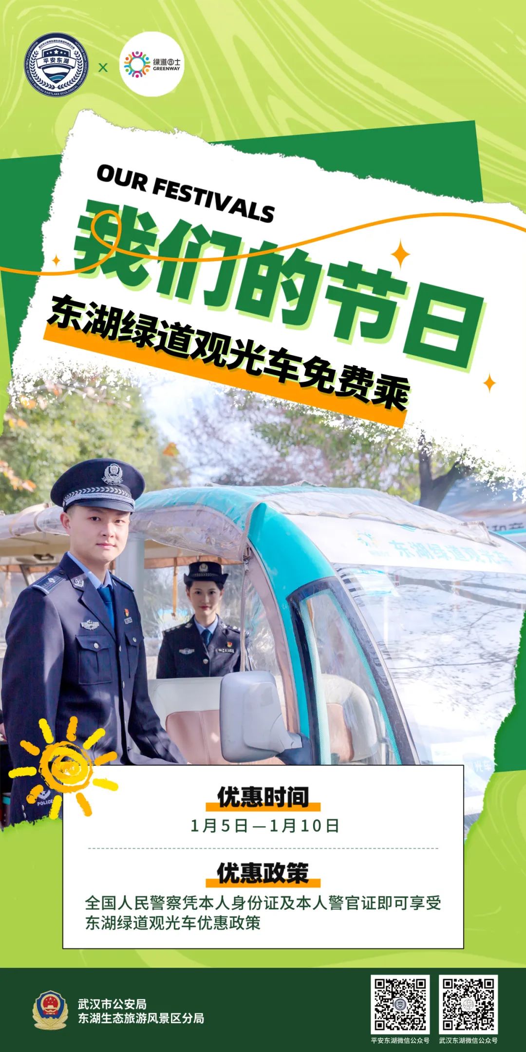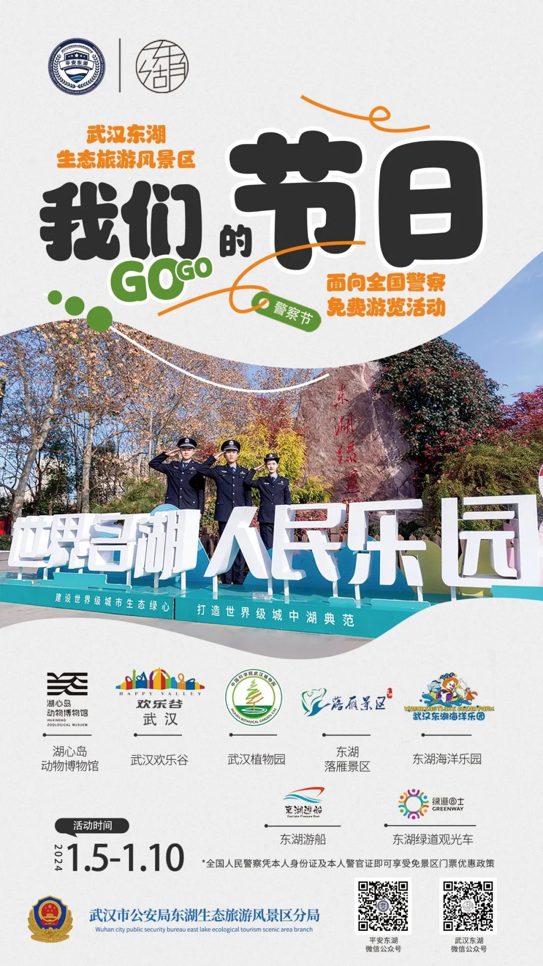 1月5日至1月10日,全国人民警察凭本人身份证及本人警官证,可免费游玩东湖落雁景区、武汉植物园、湖心岛动物博物馆、武汉欢乐谷以及东湖海洋乐园,还可免费乘坐东湖观光游览车、东湖游船。